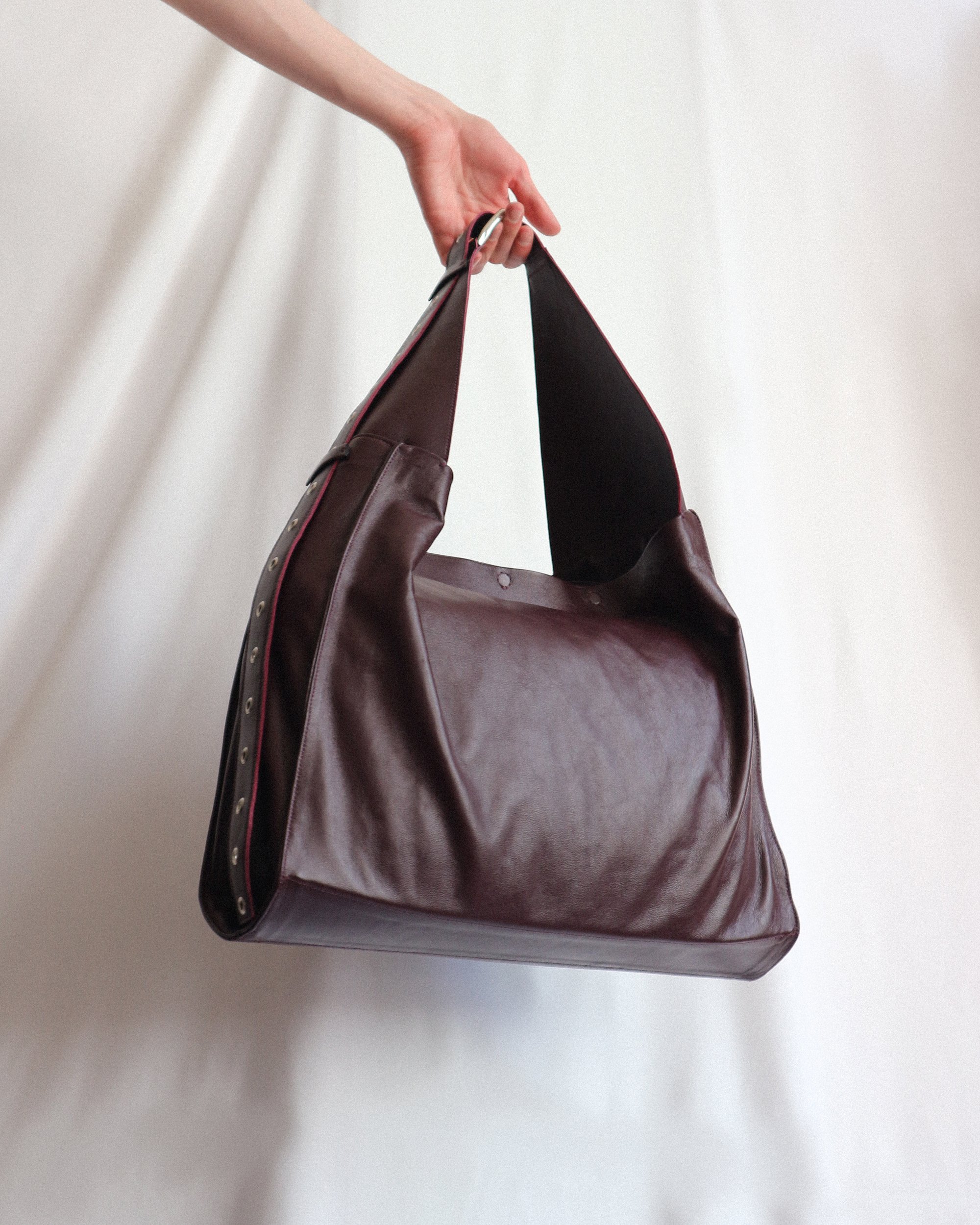 -Large format tote bag with long strap that converts the shoulder bag into a crossbody.